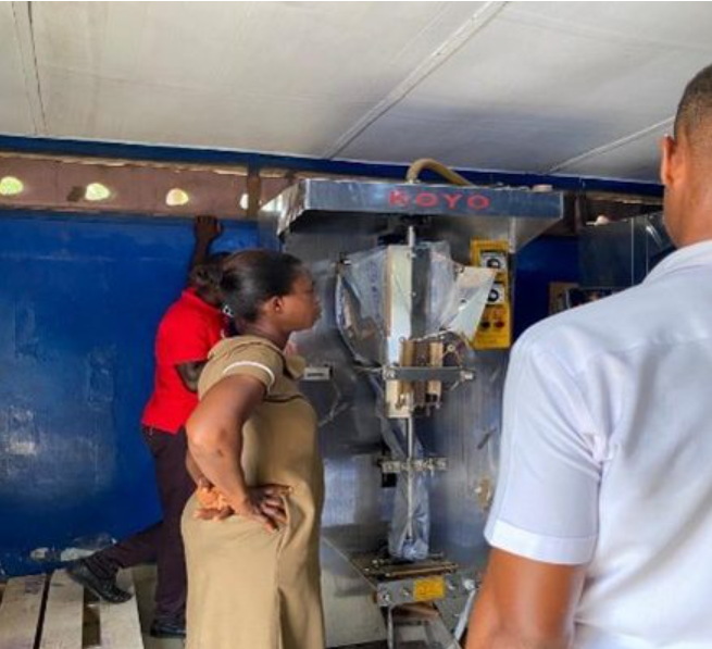 The Environmental Health Officers conducted an inspection at A1 Sachet Water Factory, located in the Kpando Municipality. The inspection was carried out under the supervision of the factory manager, who guided the officers throughout the facility. The factory employs skilled personnel trained to consistently observe safety and hygiene protocols, especially while performing their duties. Additionally, it has a designated cloakroom where personnel can change into their appropriate PPE. The facility is equipped with reservoirs for water storage and filters to ensure proper filtration and sieving of the water. The packaged water is hygienically arranged on pallets for transportation and distribution.